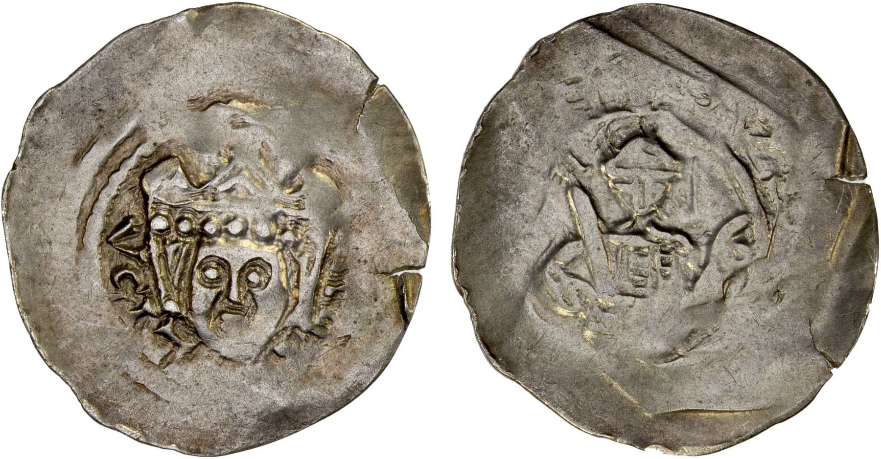 AUSTRIA: CARINTHIA: Bernhard II, 1202-1256, AR pfennig (1.21g), St. Veit, CNA-Cb112, facing half-length armored bust of duke, holding scepter and raising hand // crowned bust of Saint Veit (Saint Vitus), VF. St. Veit an der Glan is a town in the Austrian state of Carinthia (Kärnten), the administrative center of the St. Veit an der Glan District. It was the historic Carinthian capital until 1518.
