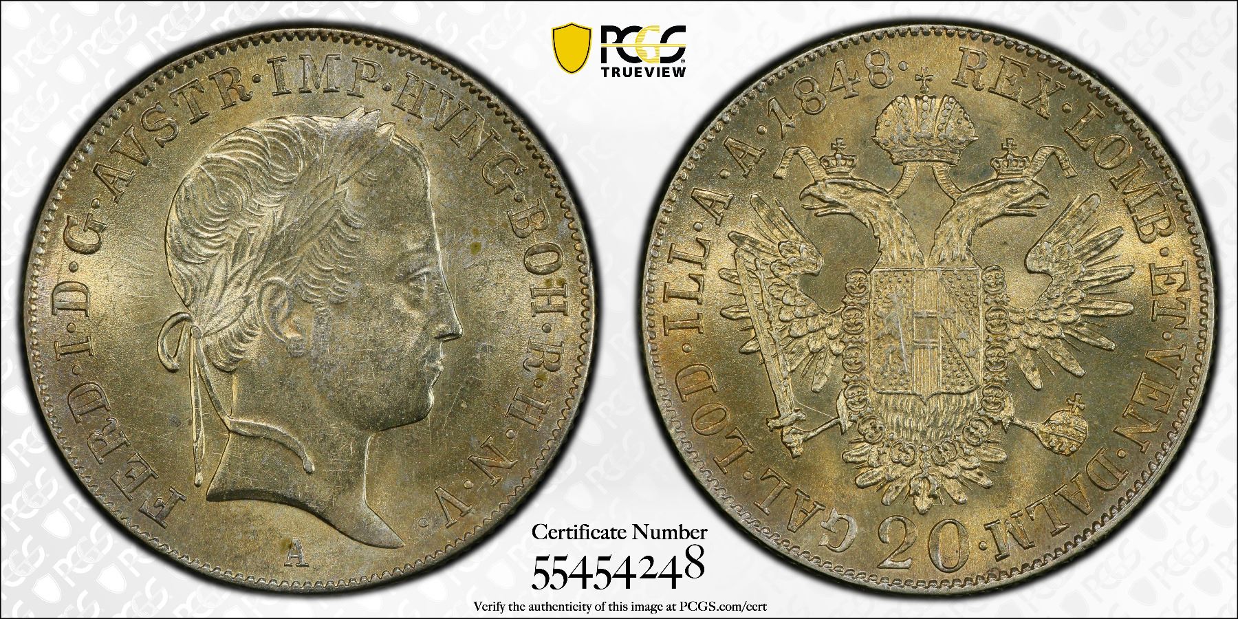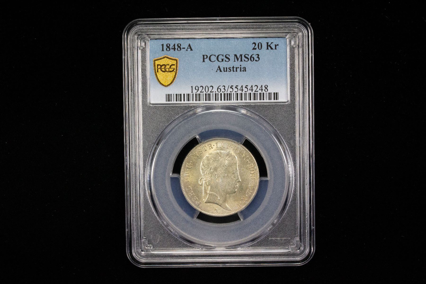 AUSTRIA: Ferdinand I, 1835-1848, AR 20 kreuzer, Vienna, 1848-A, PCGS MS63