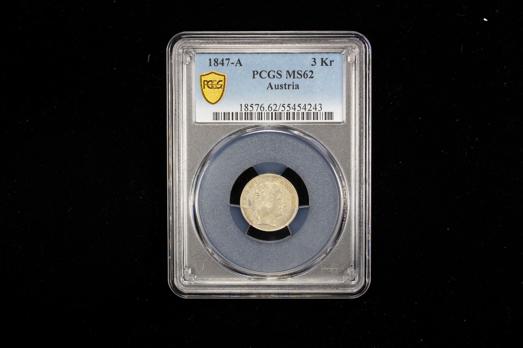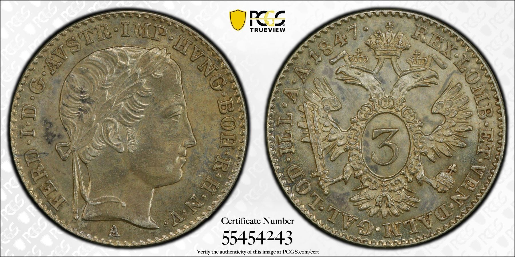 AUSTRIA: Ferdinand I, 1835-1848, AR 3 kreuzer, Vienna, 1847-A, PCGS MS62