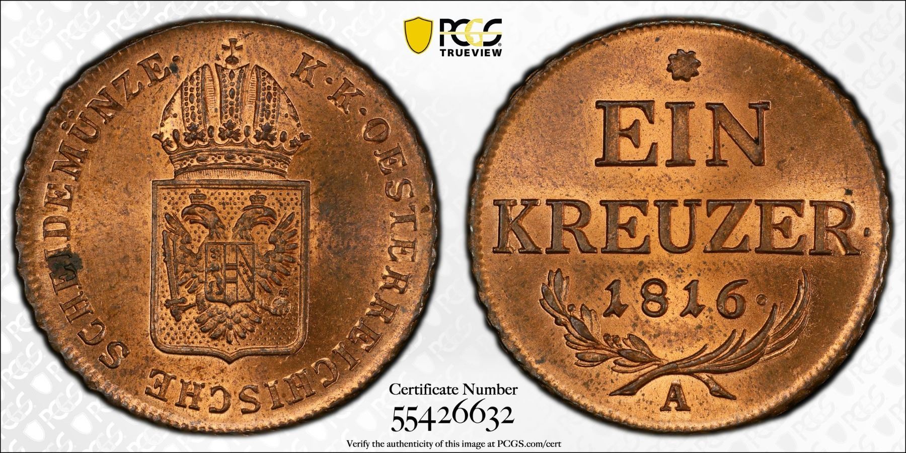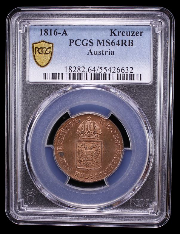 AUSTRIA: Franz, 1804-1835, AE kreuzer, 1816-A, PCGS MS64 RB
