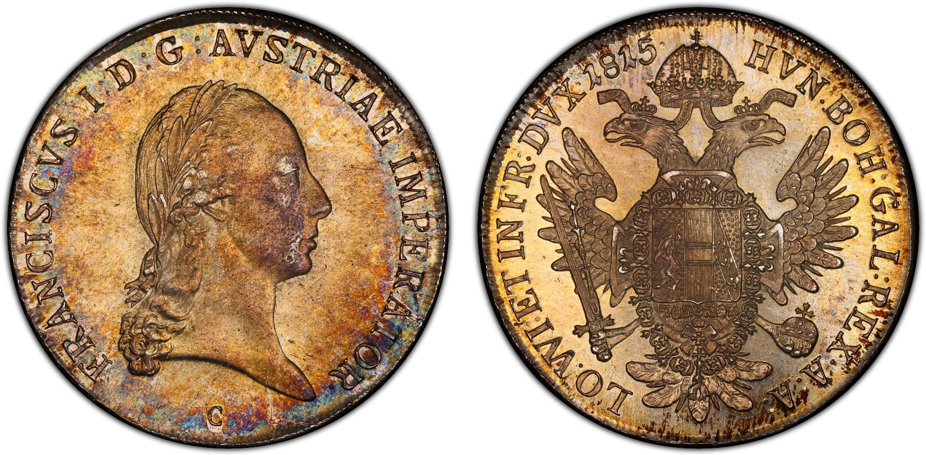 AUSTRIA: Franz II, 1792-1835, AR thaler, 1815-C, KM-2161, a wonderful toned lustrous mint state example! PCGS graded MS64.