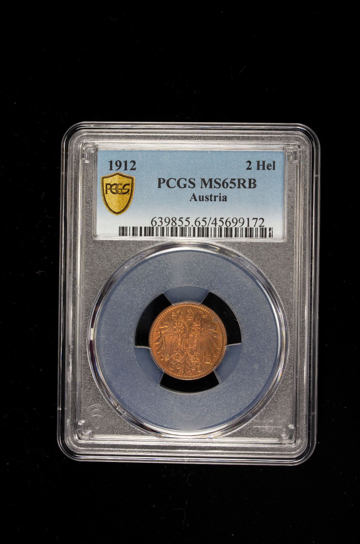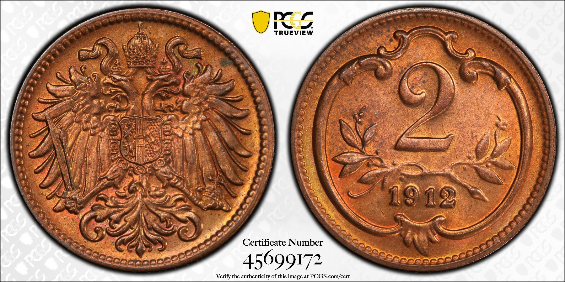 AUSTRIA: Franz Joseph, 1848-1916, AE 2 heller, 1912, PCGS MS65 RB