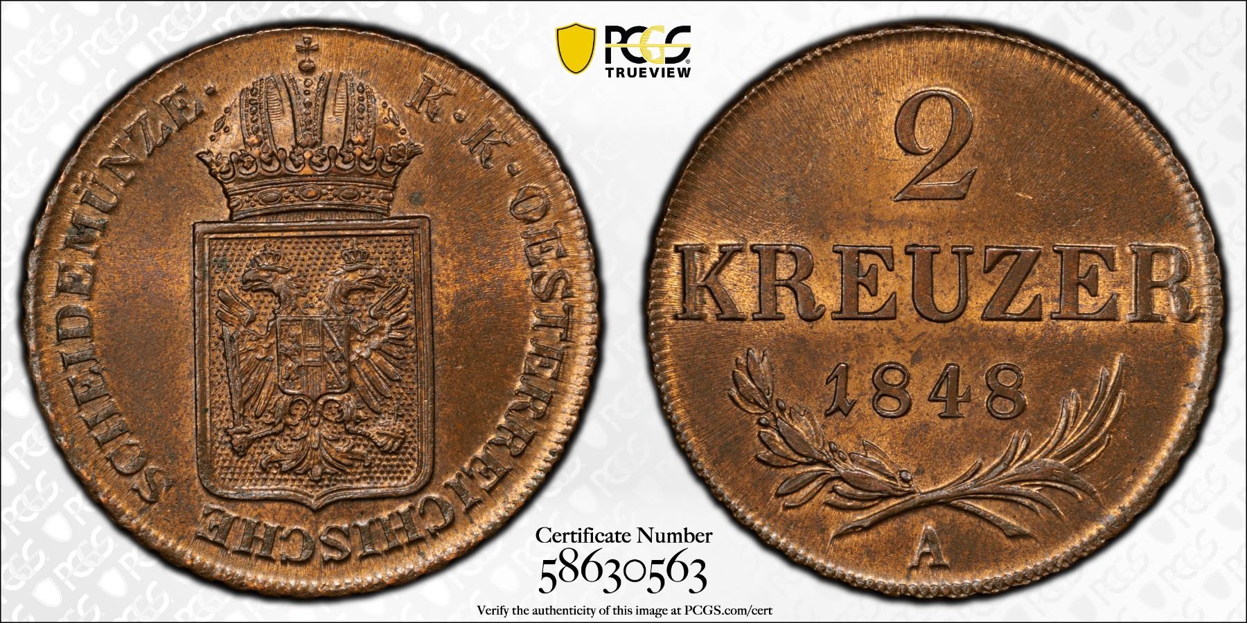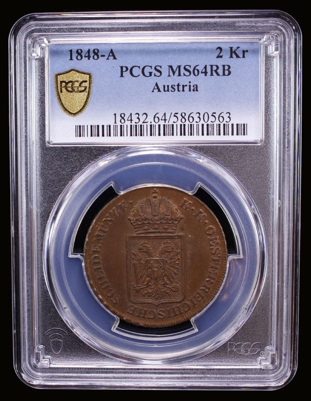 AUSTRIA: Franz Joseph I, 1848-1916, AE 2 kreuzer, 1848-A, PCGS MS64 RB