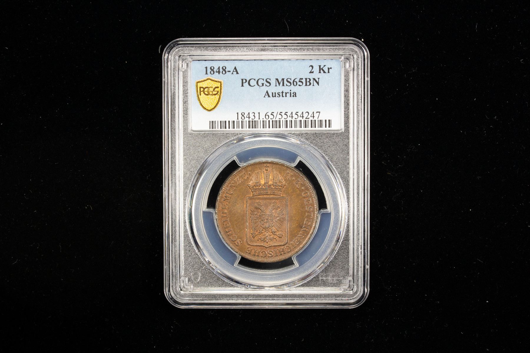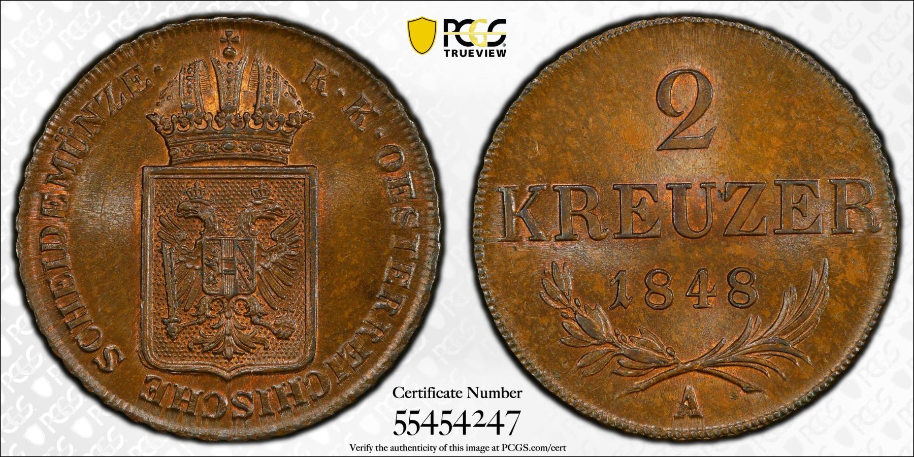 AUSTRIA: Franz Joseph I, 1848-1916, AE 2 kreuzer, Vienna, 1848-A, PCGS MS65 BN