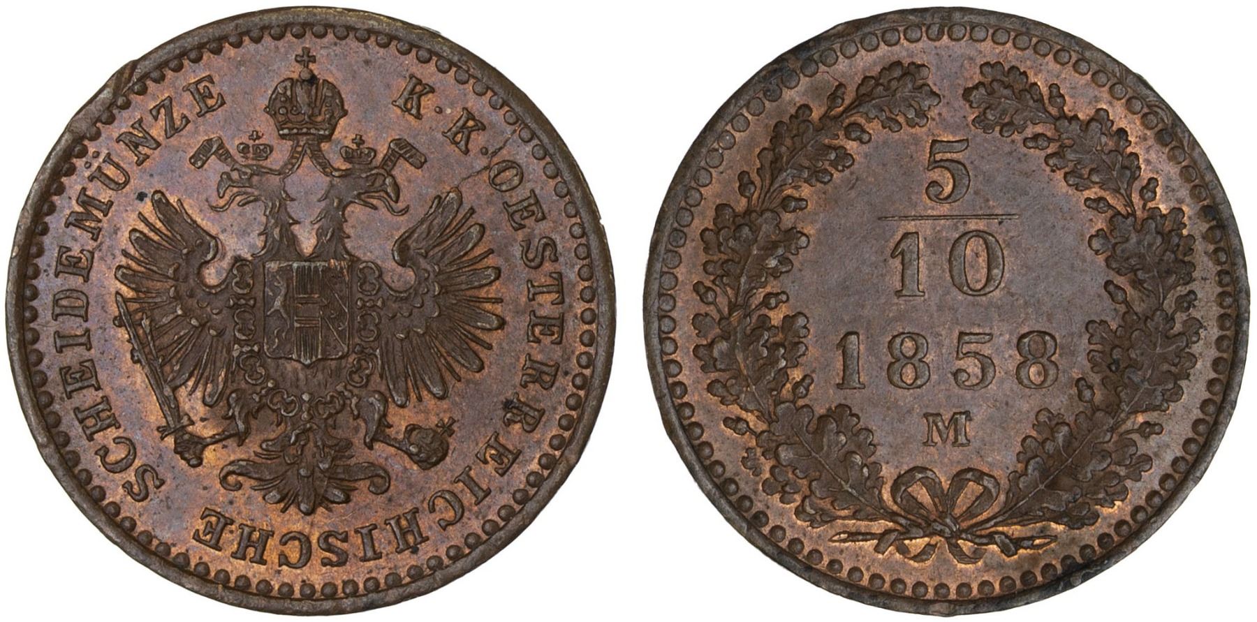 AUSTRIA: Franz Joseph I, 1848-1916, AE 5/10 kreuzer, 1858-M, KM-2182, tiny obverse rim nick, brown with some red, better date/mintmark, UNC