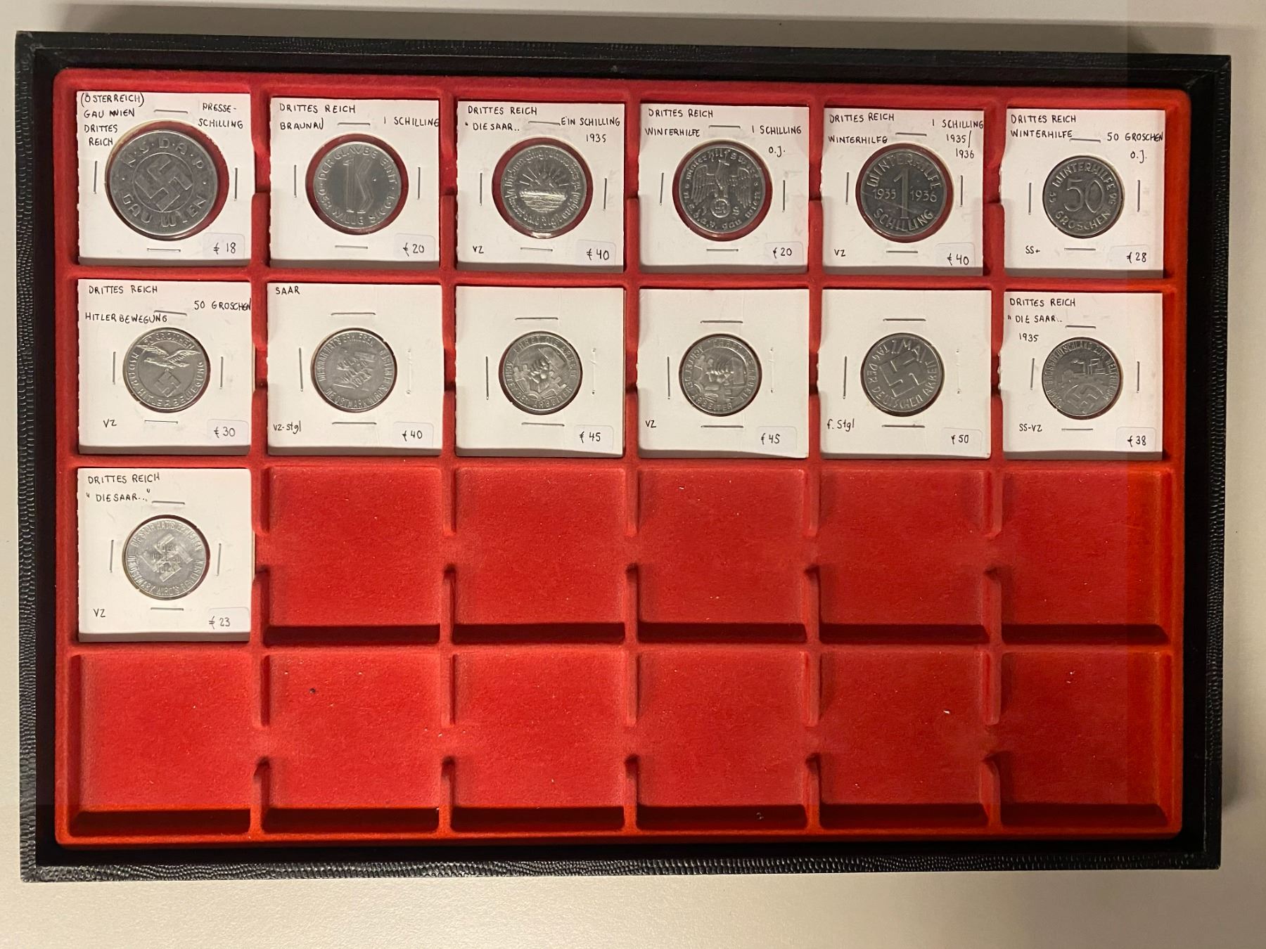 AUSTRIA: LOT of 13 tokens, all aluminum issues of the Nazi Party (NSDAP) before the Anschluss, with 5 schillings (Presseschilling, Braunau, Saar, Winterhilfe, and two different Winterhilfe types), 2 50 groschens, and 6 50 groschen-sized tokens without denomination (two of the Saar referendum, one of the reintegration of Saar, three of May Day); most Unc to BU with brilliant luster, a few with light hairlines; retail value $450, lot of 13 pieces. These items were originally produced by a regime which perpetrated crimes against humanity, war crimes, mass murder, and other acts of violence. Our firm does not endorse such activities and only offers these items as artifacts of history to further research and civil enlightenment.