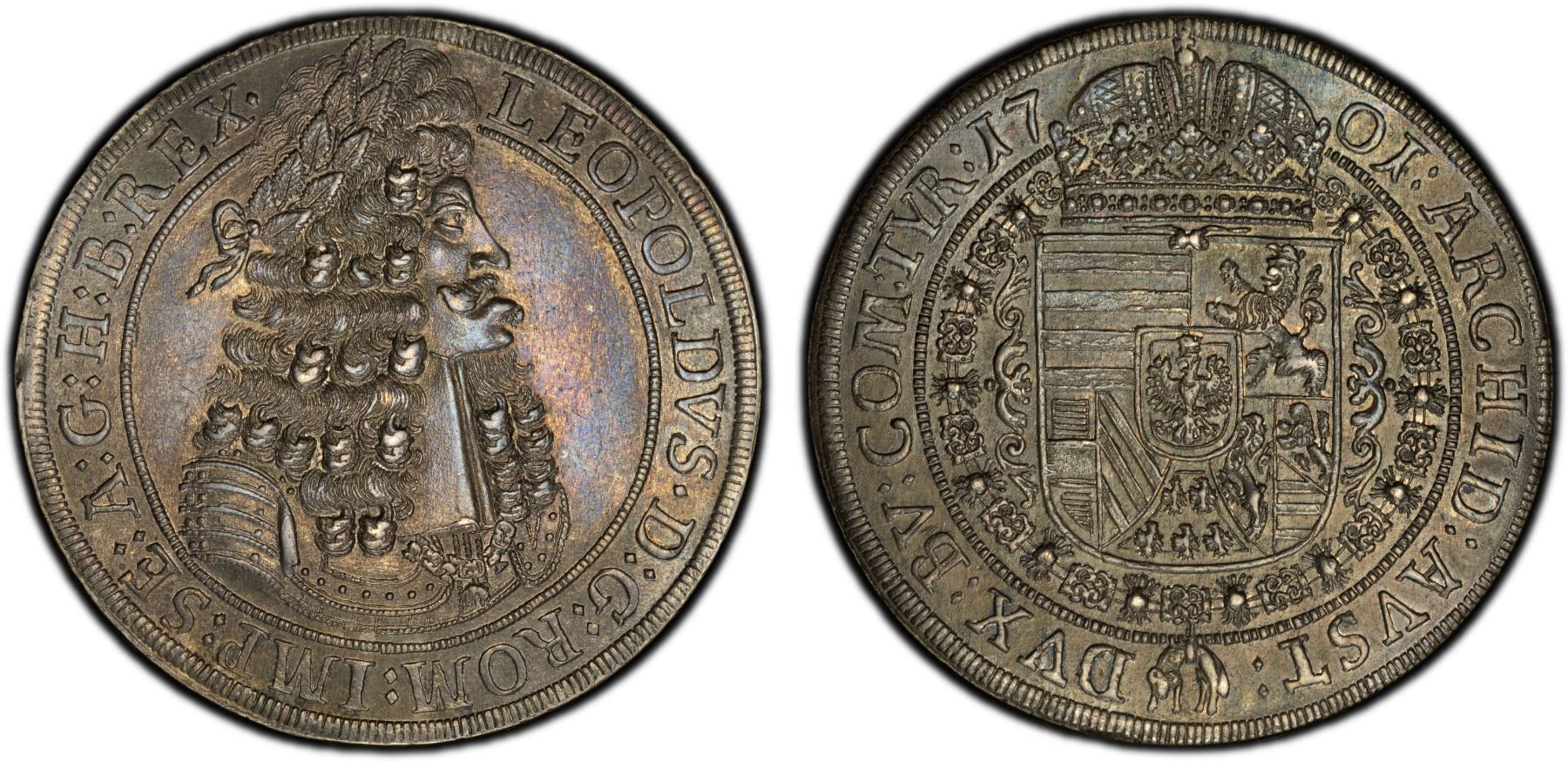 AUSTRIA: Leopold I, 1657-1705, AR thaler, Hall, 1701, KM-1303.4, Dav-1003, variety without initials, deeply toned, wonderful bold strike, PCGS graded MS62.