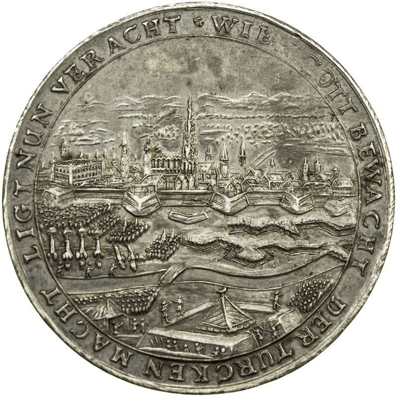 AUSTRIA: Leopold I, 1658-1705, AR medal, 1683, Mont-916; Julius-192; Hirsch-55; Würz-7216, 44mm, The Second Ottoman Siege of Vienna, WIEN GOTT BEWACHT DER TURCKEN MACHT LIGT NUN VERACHT around city panorama with the armies and artillery in formation / DIESE MÜNTZ / ZEIGET DIE Ao. 1683 / 14/4 IUL. VON MAHUMED IV / BELAGERTE STATT WIEN / WELCHE ABER DURCH GOTT / UND DER KAŸS: POLN: UND / REICHS-VöLCKER TAPFER: / KEIT DEN 12/2 SEPT: WIER: / DER DAVON BEFREY: / ET WORDEN, plain edge, overstruck on same medal, EF, S.