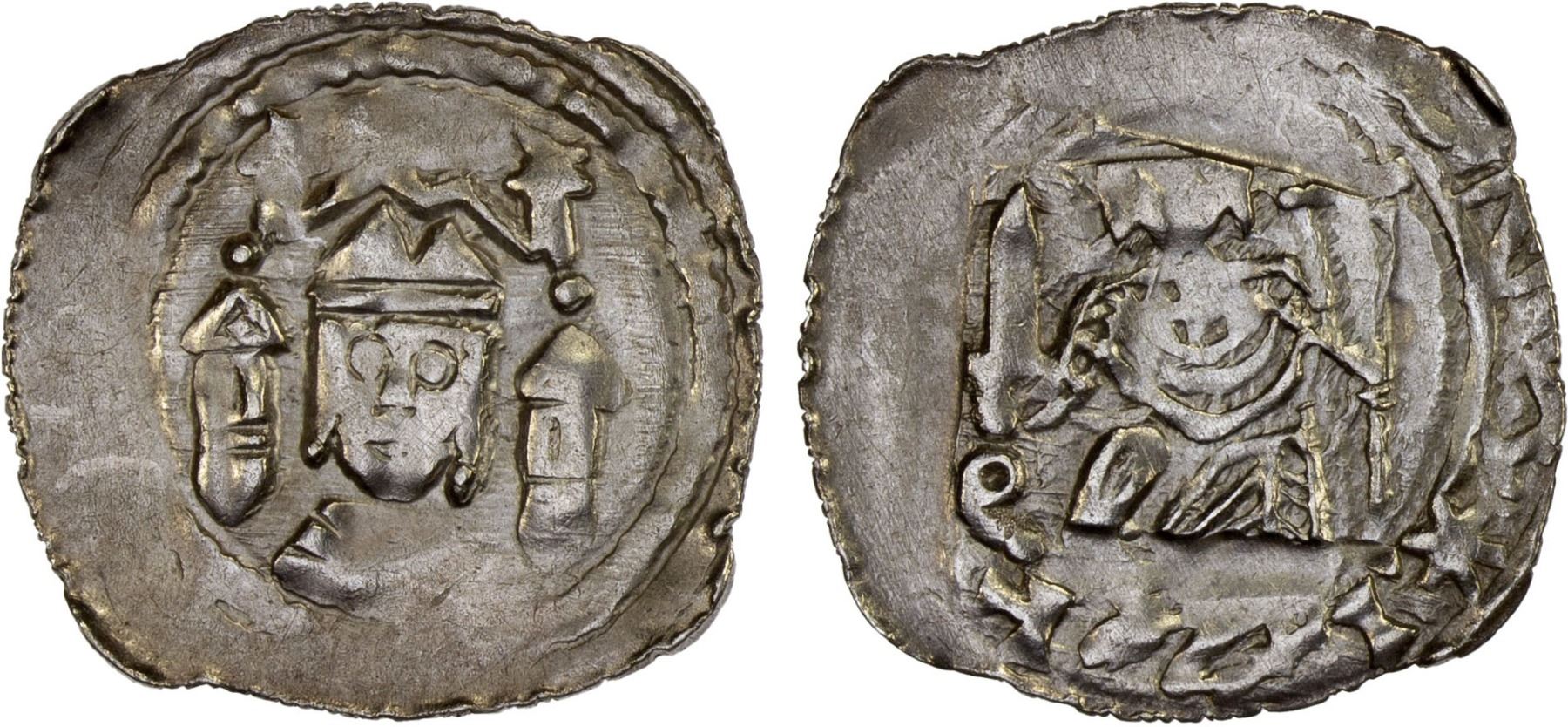 SALZBURG: Eberhard II von Regensburg, 1200-1246, AR pfennig (1.01g), CNA-Ca19, head with two pointed hat between two towers, double circle around // cross above standing figure holding sword, XF.