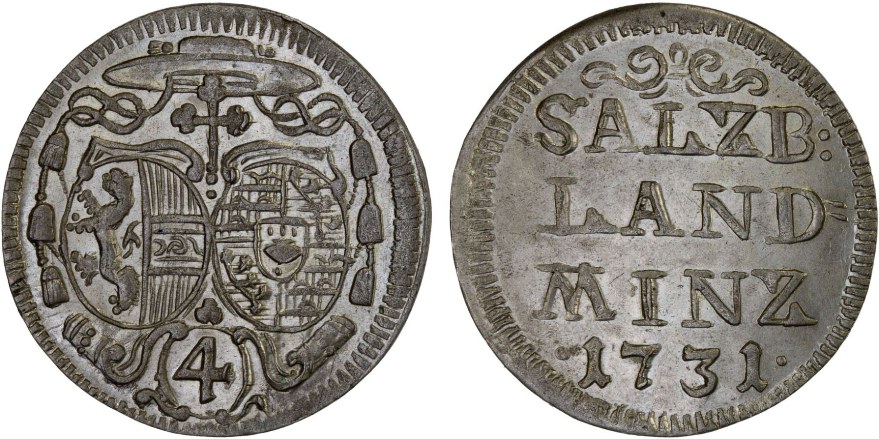 SALZBURG: Leopold Anton von Firmian, 1727-1744, AR 4 kreuzer, 1731, KM-336, Zöttl-2599, struck with roller dies, faint surface hairlines, Unc. This denomination is alsois known as a "Landbatzen."