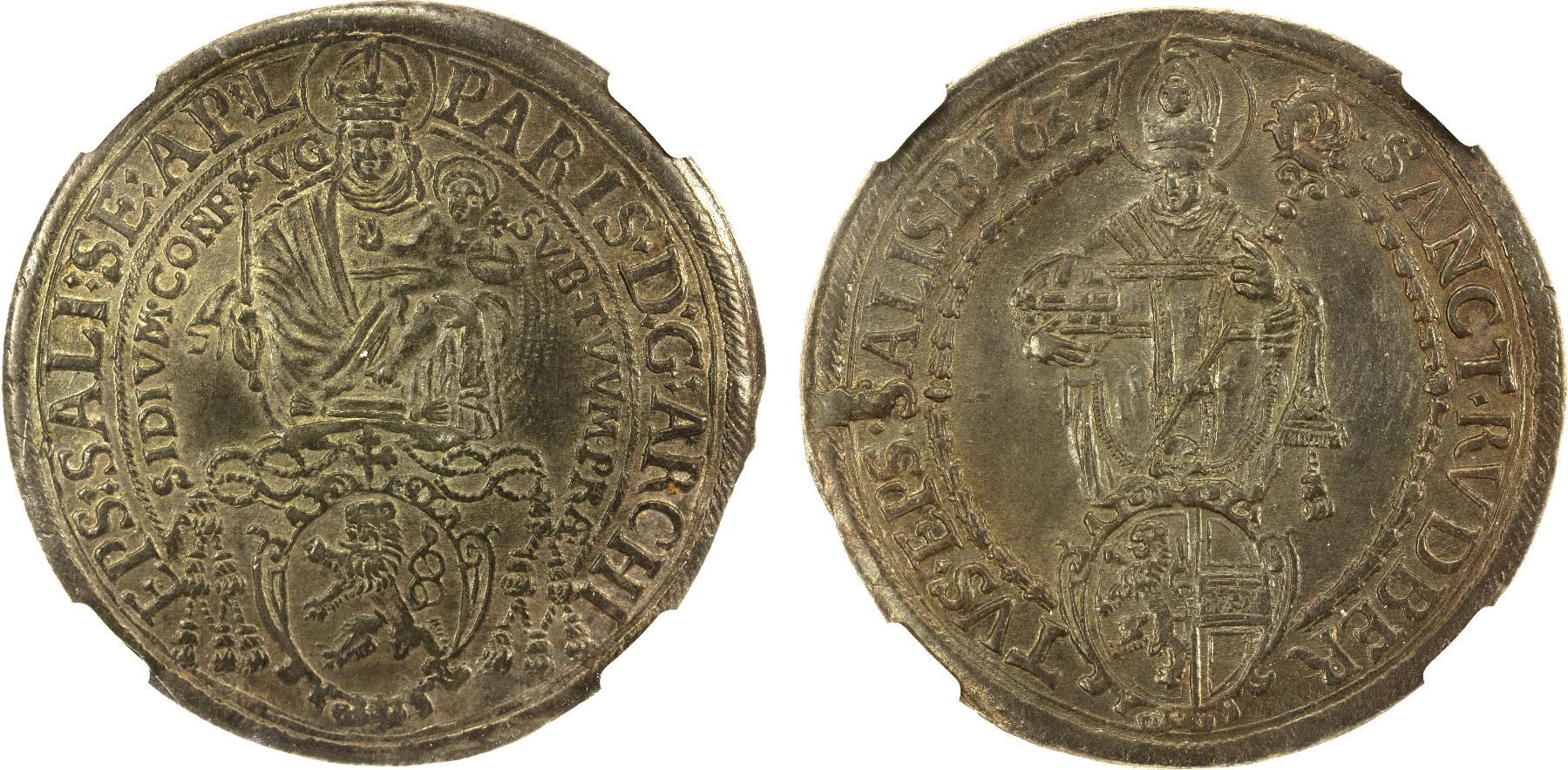 SALZBURG: Paris von Lodron, 1619-1653, AR thaler, 1637, KM-87, Dav-3504, Madonna with Child standing above coat of arms of the Archbishop // St. Rupert holding at left hand his salt box and at right hand a crozier, standing above the arms of Salzburg, an attractively toned example, NGC graded AU55.