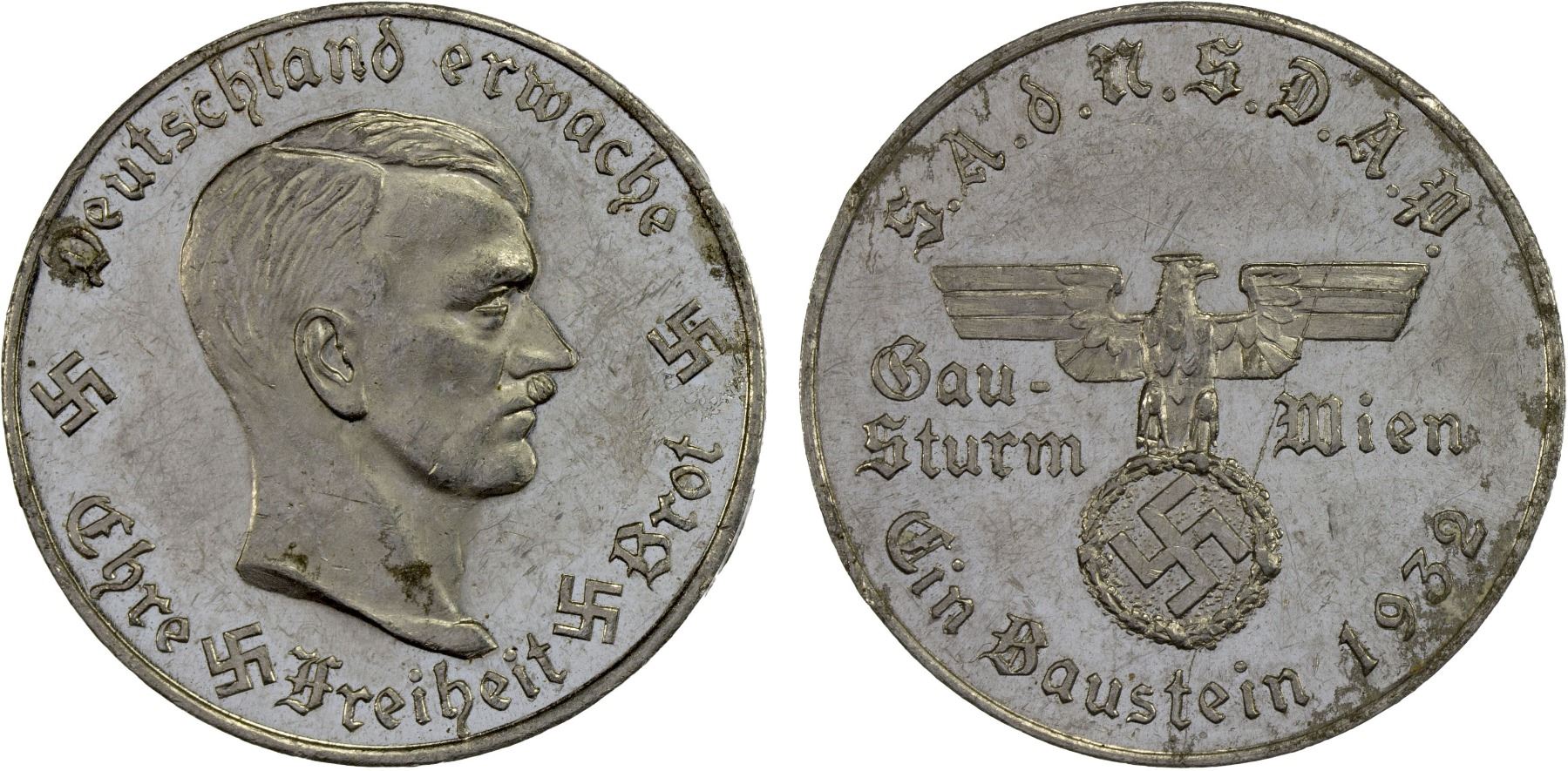 AUSTRIA: aluminum medal, 1932, issued for the Vienna Gausturm of the Sturmabteilung (i.e. Brown Shirts) of the NSDAP, bust of Adolf Hitler right // eagle on swastika, Ein Baustein ("one brick") below, fully lustrous, a few faint marks, Unc. This item was originally produced by a regime which perpetrated crimes against humanity, war crimes, mass murder, and other acts of violence. Our firm does not endorse such activities and only offers this item as an artifact of history to further research and civil enlightenment.