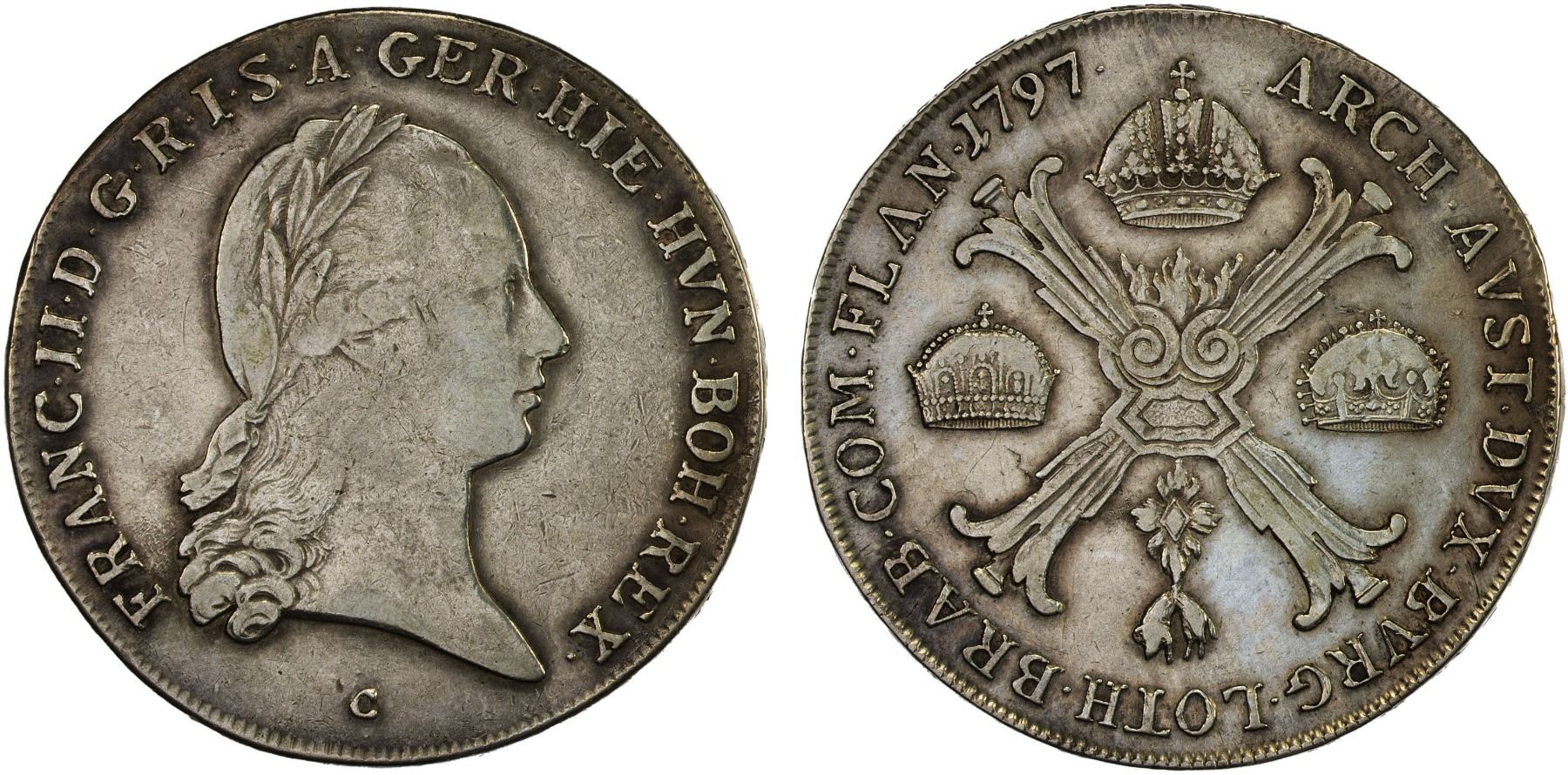 AUSTRIAN NETHERLANDS: Francis II, 1792-1797, AR kronenthaler, Prague, 1797-C, KM-62, Dav-1180, Herinek-509, cleaned, VF.