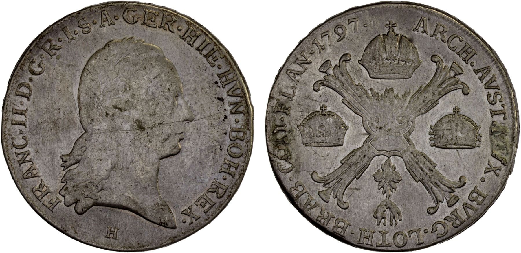 AUSTRIAN NETHERLANDS: Franz II, 1792-1795, AR kronenthaler, Günzburg, 1797-H, KM-62, cleaned, VF-XF. The Kronenthaler was first issued in 1755 in the Austrian Netherlands and it became a popular trade coin throughout Europe. The kronenthaler was initially issued with the same weight as the French écu.