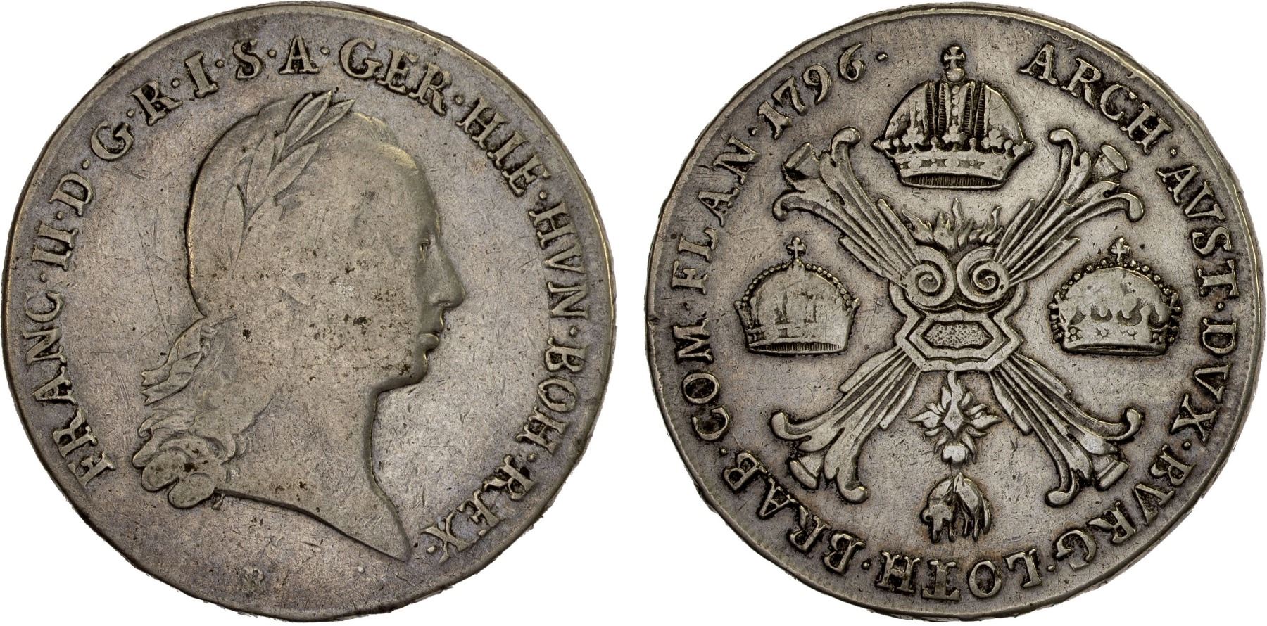 AUSTRIAN NETHERLANDS: Franz II, 1792-1795, AR kronenthaler, Kremnica, 1796-B, KM-62, Fine. The Kronenthaler was first issued in 1755 in the Austrian Netherlands and it became a popular trade coin throughout Europe. The kronenthaler was initially issued with the same weight as the French écu.