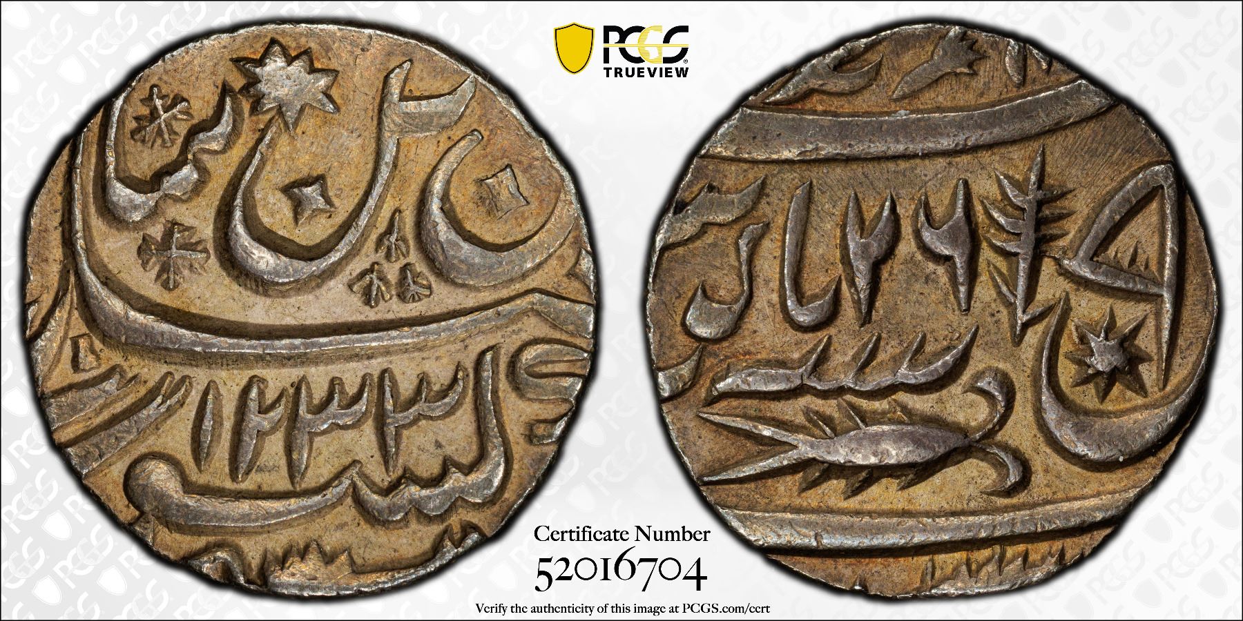 AWADH: AR rupee (11.24g), Muhammadabad Banaras, AH1223 year 26, KM-103.2, in the name of Shah Alam II, frozen regnal year, with flag, star, and fish privy marks, PCGS graded AU55.