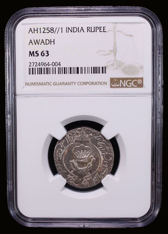 AWADH: Amjad Ali Shah, 1842-1847, AR rupee, Lucknow, AH1258 year 1 (ahad), KM-336, NGC graded MS63.