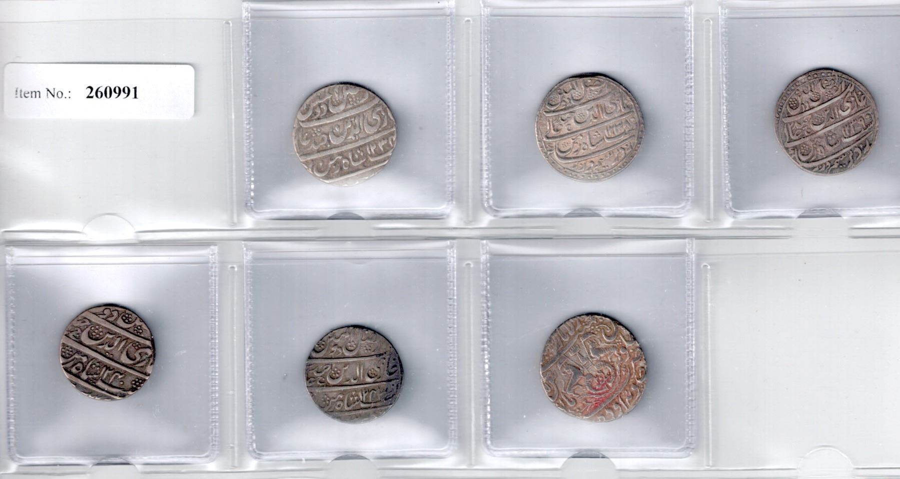 AWADH: Ghazi-ud-Din Haidar, 1819-1827, LOT of 6 silver rupees: KM-146: AH1234 frozen year 26 (choice VF); KM-165.1: AH1234 year 5 (sic, F-VF); and KM-165.2: 1238 year 4 (EF), 1239 year 5 (choice VF), 1240 year 6 (VF), and 1243 year 9 (VF-EF); retail value $525, lot of 6 pieces.