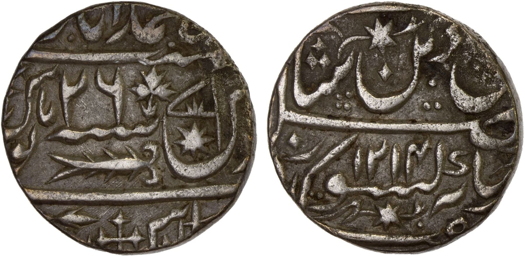 AWADH: Sa'adat Ali Khan II, 1798-1814, AR rupee, Lucknow, AH1214 year 26, KM-103.2, in the name of Shah Alam II, with fish, star and flag symbols, VF.