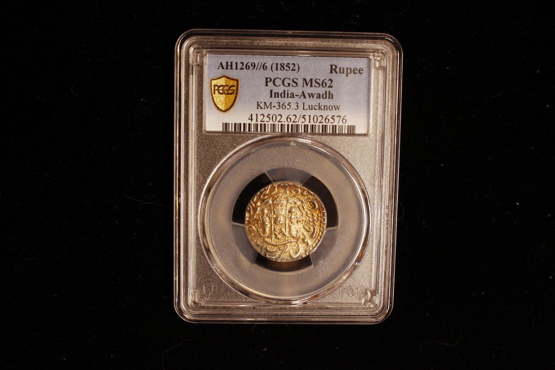 AWADH: Wajid Ali Shah, 1847-1856, AR rupee (11.11g), Lucknow, AH1269 year 6, KM-365.3, a pleasing lightly toned mint state example, PCGS graded MS62. Wajid Ali Shah (1822-1887) was the tenth and last Nawab of Awadh, holding the position for 9 years starting February 13, 1847. His kingdom, long protected by the British under treaty, was eventually annexed bloodlessly on February 11, 1856, two days before the ninth anniversary of his coronation.