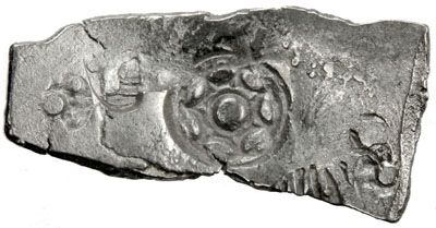 AYODHYA: Anonymous, ca. 600-400 BC, AR 5 shana (6.19g), Ra-1234var, 7-petal flower, 4 merchant marks, long rectangular flan, choice Extremely Fine. The design is closer to the stamp on Rajgor-1235 of about 5.3 grams, but belongs to the series of Rajgor-1234.