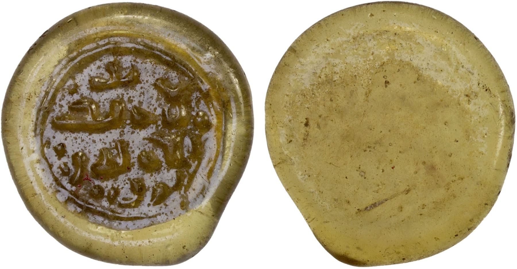AYYUBID OR EARLY MAMLUK: Contemporary imitation, 13th/14th century, glass weight (jeton) (3.01g), A-746G, 4-line blundered Arabic inscription, slightly greenish tan, translucent, VF, ex SARC Auction 12, lot 334 (called Fatimid), ex Ismail al-Imam Collection.