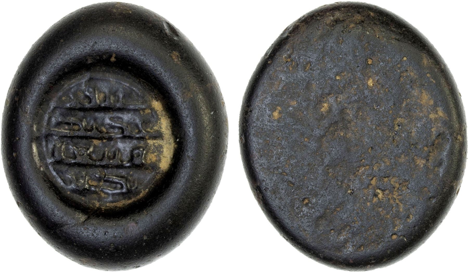 AYYUBID PERIOD: Contemporary imitation, 12th/13th century, glass weight (jeton) (5.91g), A-746G, 4-line blundered meaningless inscription, dark brown, opaque, XF, ex SARC Auction 12, lot 337 (called Fatimid), ex Ismail al-Imam Collection.