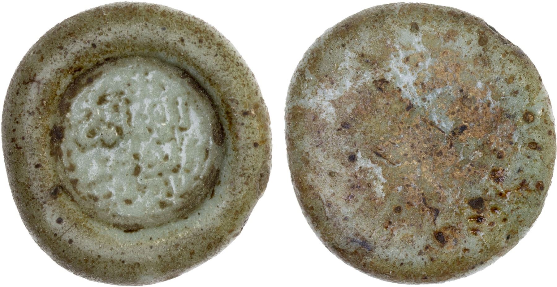 AYYUBID: al-Nasir Yusuf I (Saladin), 1169-1193, glass weight (jeton) (5.93g), NM, ND, A-793.2, in the name of the Abbasid caliph al-Nasir li-din Allah, who was caliph 1180-1225, reasonably clear legend; grayish green, almost opaque, with just a little devitrification, VF, ex Ismail al-Imam Collection.