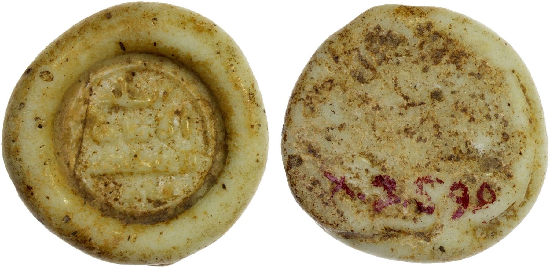 AYYUBID: al-Nasir Yusuf I (Saladin), 1169-1193, glass weight (jeton) (5.96g), NM, ND, A-793.1, in the name of the Abbasid caliph al-Mustadi bi-amr Allah, who was caliph 1171-1180, bold legend; parchment tan color, opaque; lovely example! bold VF, RR, ex SARC Auction 12, lot 300 (incorrectly assigned to the Imam al-Mustansir), ex Ismail al-Imam Collection.