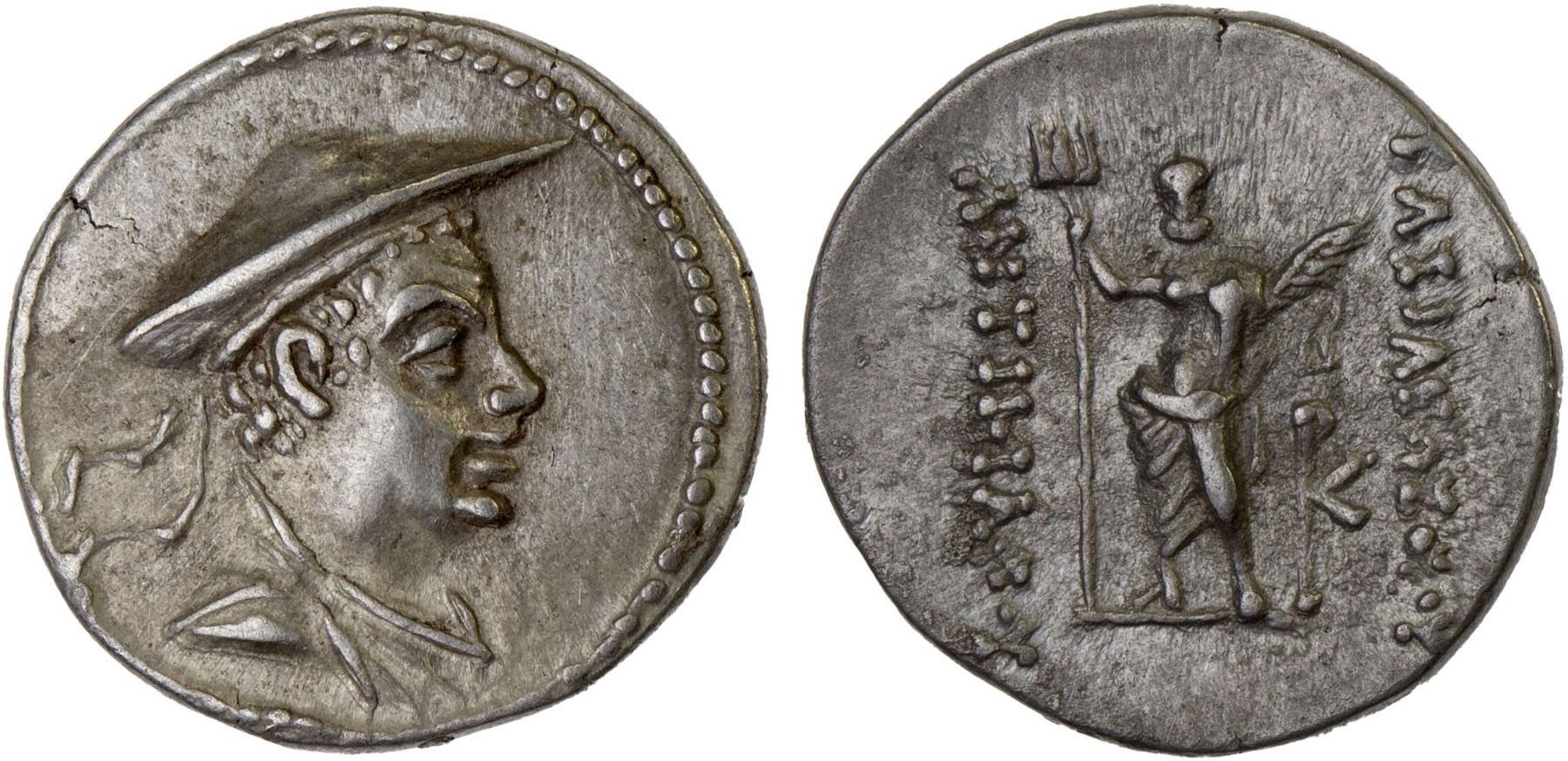 BACTRIA: Antimachos I Theos, ca. 185-170 BC, AR hemidrachm (2.11g), Bop-3A, Mitch-126 (monogram not listed), diademed and draped bust right, wearing kausia // Poseidon standing facing, holding trident and filleted palm, monogram to inner right, BAΣIΛEΩΣ ΘEOY / ANTIMAΧOY, extremely rare denomination and even rarer monogram, scattered hairlines, Choice XF.