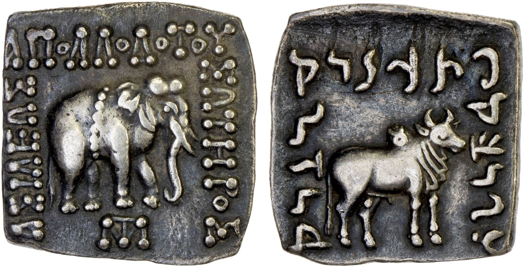 BACTRIA: Apollodotos I, c. 160-150 BC, AR square drachm (2.39g), Bop-variant of 4F, elephant, monogram below // humped bull, but without the reverse monogram normally found on type Bop-4F, bold VF.