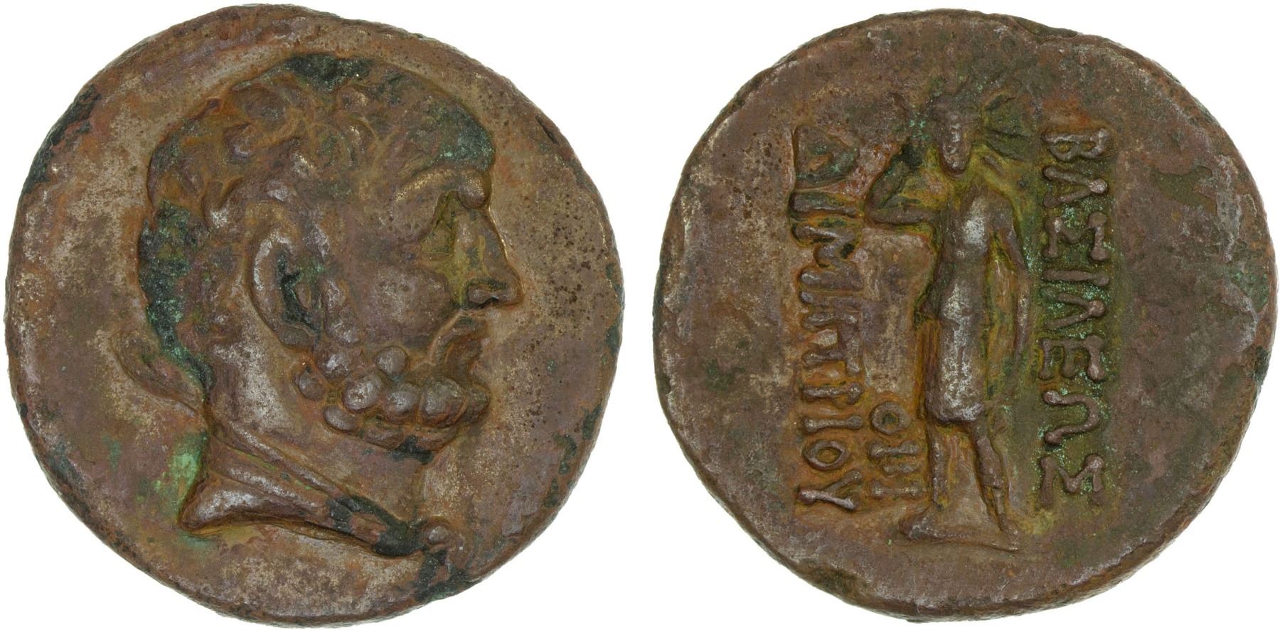 BACTRIA: Demetrios I Aniketos, ca. 200-185 BC, AE unit (3.76g), Bop-4F, Bearded bust of Herakles to right, wearing lion skin; club over shoulder // Artemis standing facing, holding bow and drawing arrow from quiver to left, monogram to inner right; porous surfaces, VF, R.