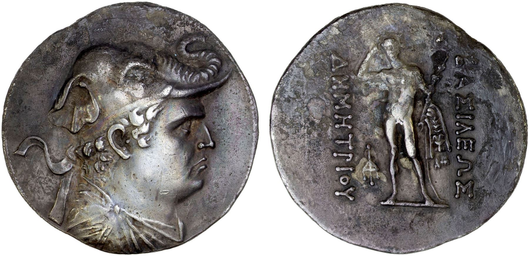 BACTRIA: Demetrios I Aniketos, ca. 200-185 BC, AR tetradrachm (16.19g), Bop-1B, Mitch-103b, diademed and draped bust right, wearing elephant headdress // Herakles standing facing, crowning himself, holding club and lion skin, monogram to lower inner left, some peripheral corrosion and light smoothing, Choice VF.