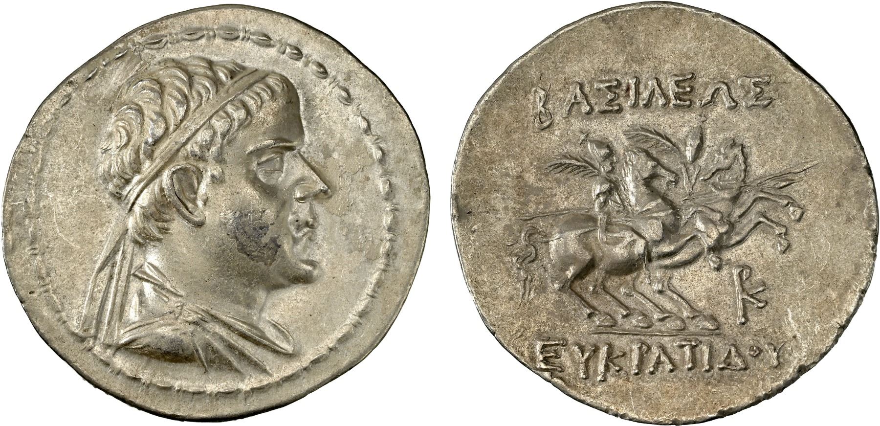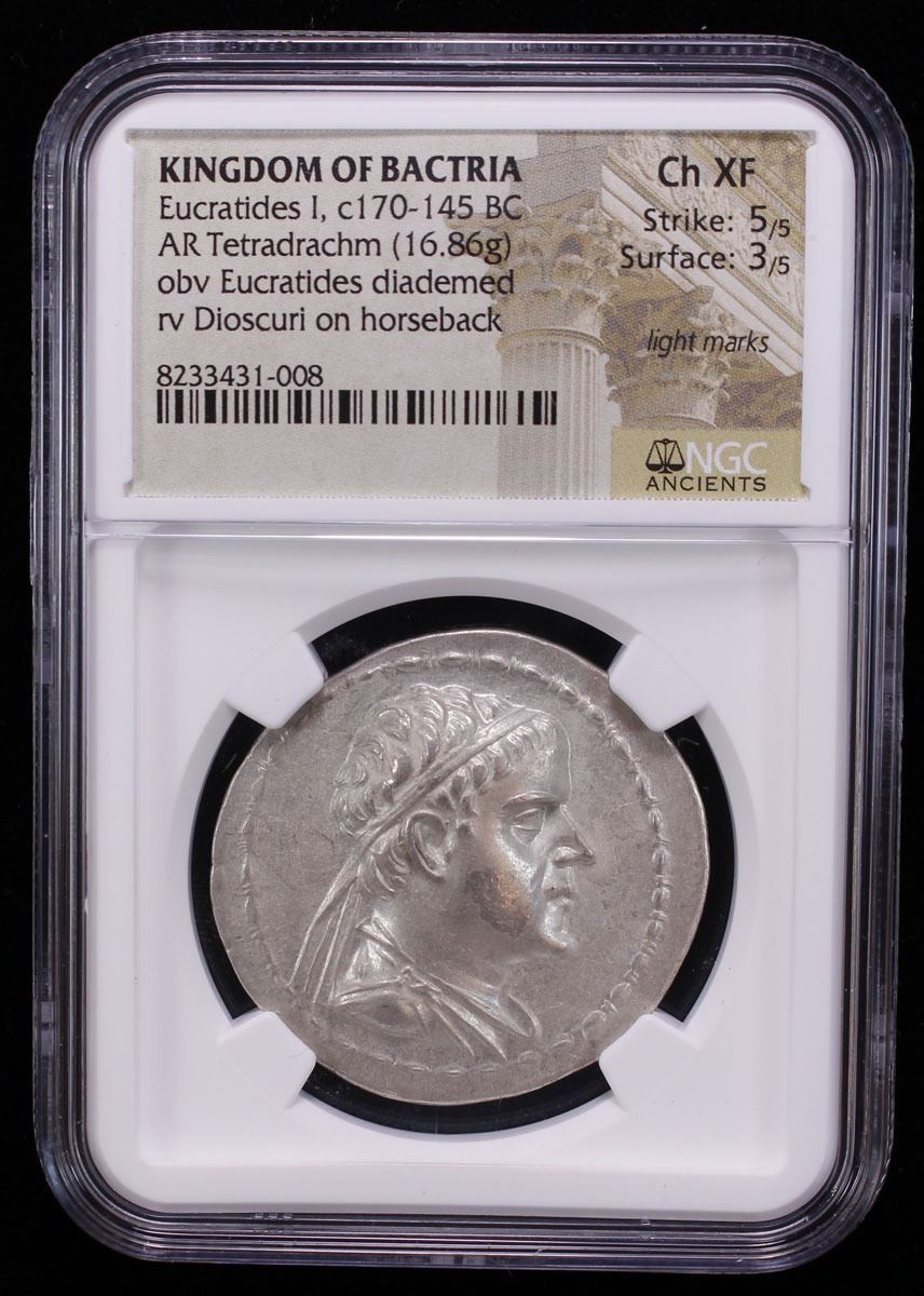 BACTRIA: Eukratides I Megas, ca. 170-145 BC, AR tetradrachm (16.86g), Bop-1B, diademed and draped bust right // the Dioskouroi on horses prancing right, each holding spear and palm, monogram to lower right, boldly struck in high relief, faint marks, light luster, Strike 5/5, Surface 3/5, NGC graded Choice XF. Eukratides I 'the Great' was one of the most important rulers of the Greco-Bactrian Kingdom. During a roughly 26-year reign, he conquered large swaths of Pakistan and northern India and issued some of the finest coins of the ancient world, including a unique gold 20 stater (169.2g). It is through these miniature works of art bearing his image that he is remembered to this day.