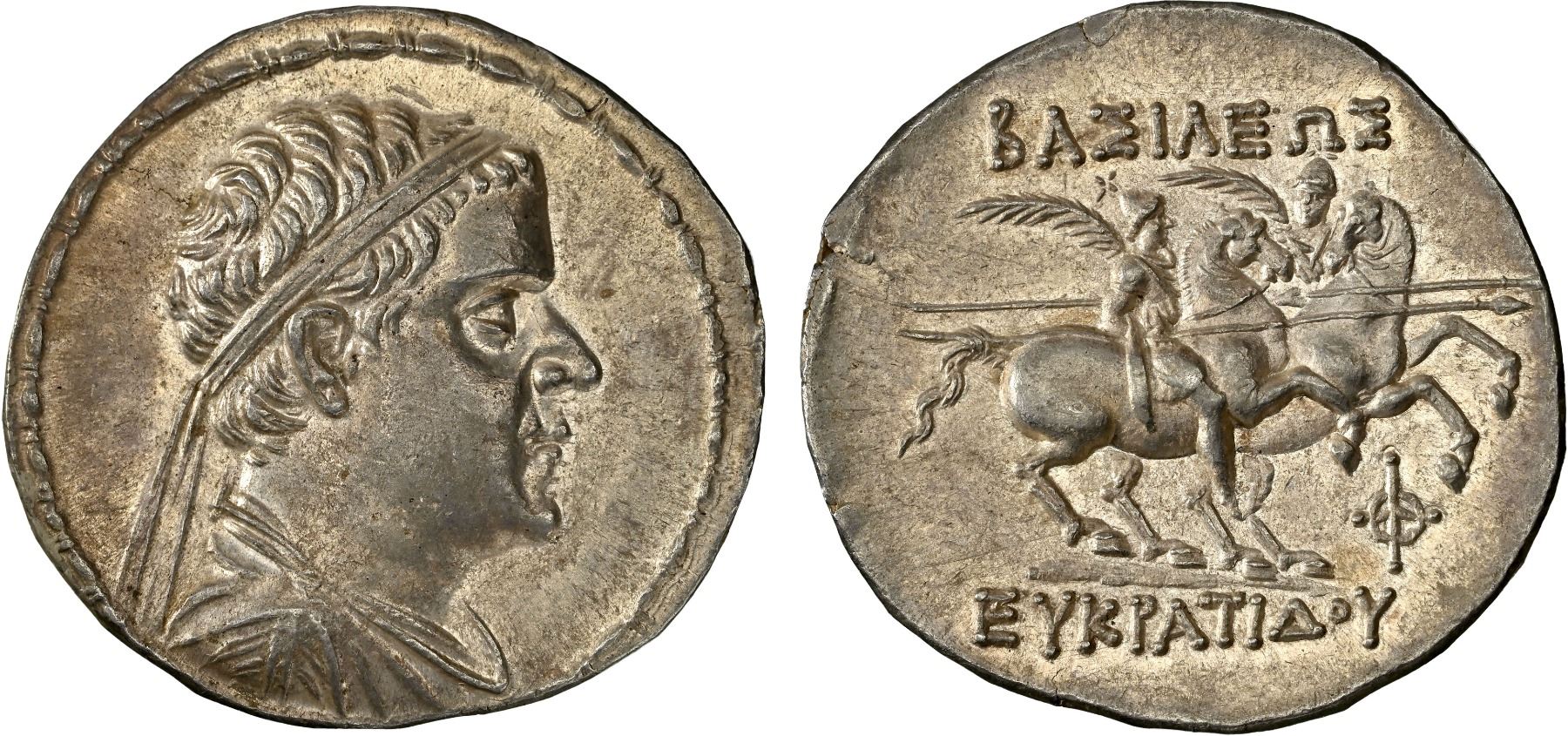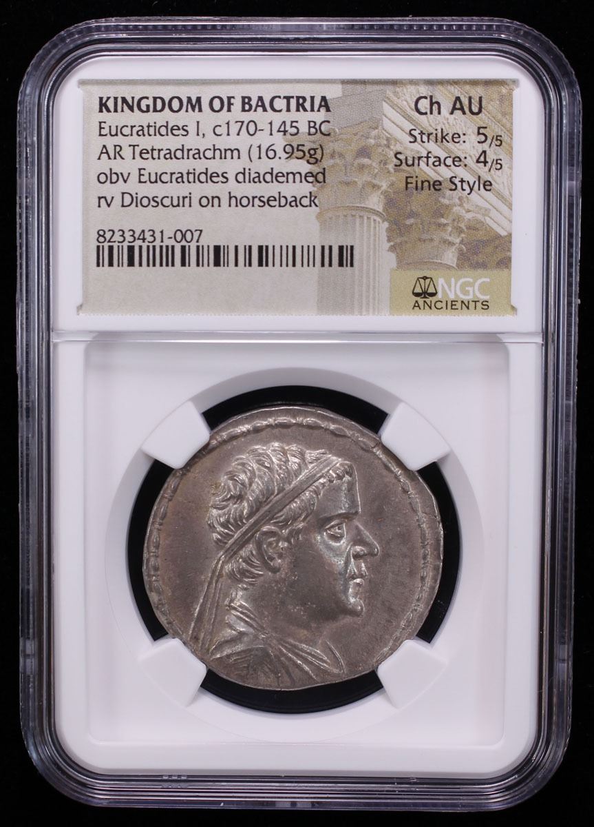 BACTRIA: Eukratides I Megas, ca. 170-145 BC, AR tetradrachm (16.95g), Bop-1D, diademed and draped bust right // the Dioskouroi on horses prancing right, each holding spear and palm, monogram to lower right, a wonderful strike from a pair of well-executed dies, lustrous with a touch of toning, a gorgeous demonstration of the numismatic mastery of the Bactrian artisans, Strike 5/5, Surface 4/5, Fine Style, NGC graded Choice AU. Eukratides I 'the Great' was one of the most important rulers of the Greco-Bactrian Kingdom. During a roughly 26-year reign, he conquered large swaths of Pakistan and northern India and issued some of the finest coins of the ancient world, including a unique gold 20 stater (169.2g). It is through these miniature works of art bearing his image that he is remembered to this day.