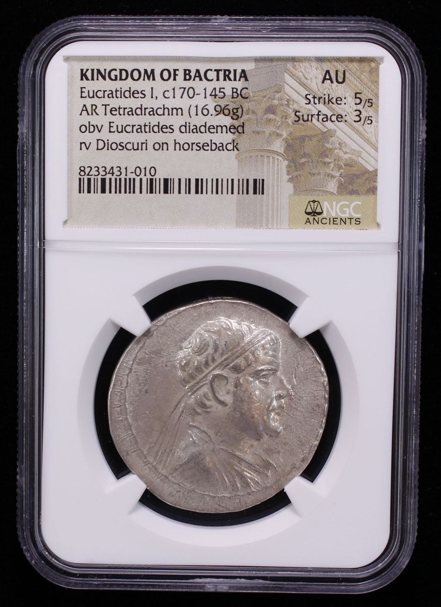 BACTRIA: Eukratides I Megas, ca. 170-145 BC, AR tetradrachm (16.96g), Bop-1C, diademed and draped bust right // the Dioskouroi on horses prancing right, each holding spear and palm, monogram to left, Δ to lower right, lovely depiction of the equestrian theme, with much luster, Strike 5/5, Surface 3/5, NGC graded AU