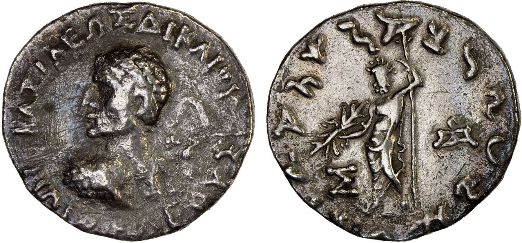 BACTRIA: Heliokles II Dikaios, ca. 110-100 BC, AR tetradrachm (8.68g), Bop-4var (unpublished control marks), diademed heroic bust left, holding spear in right hand and wearing aegis on left shoulder // Zeus standing facing, holding thunderbolt, Σ to left, monogram to right, some porosity and smoothing, unpublished and apparently unique, VF.