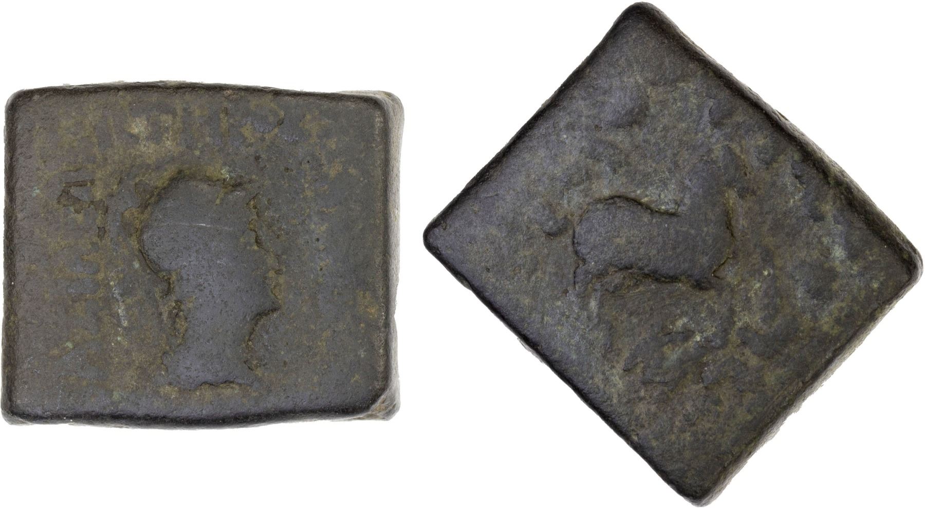 BACTRIA: Menander I Soter, ca. 155-130 BC, AE diobol (16 chalkoi) (44.76g), Bop-24A, SNG ANS 912, helmeted head of Athena right // horse prancing right, monogram below, VG. This is the largest and heaviest type of the copper coins of Bactria.