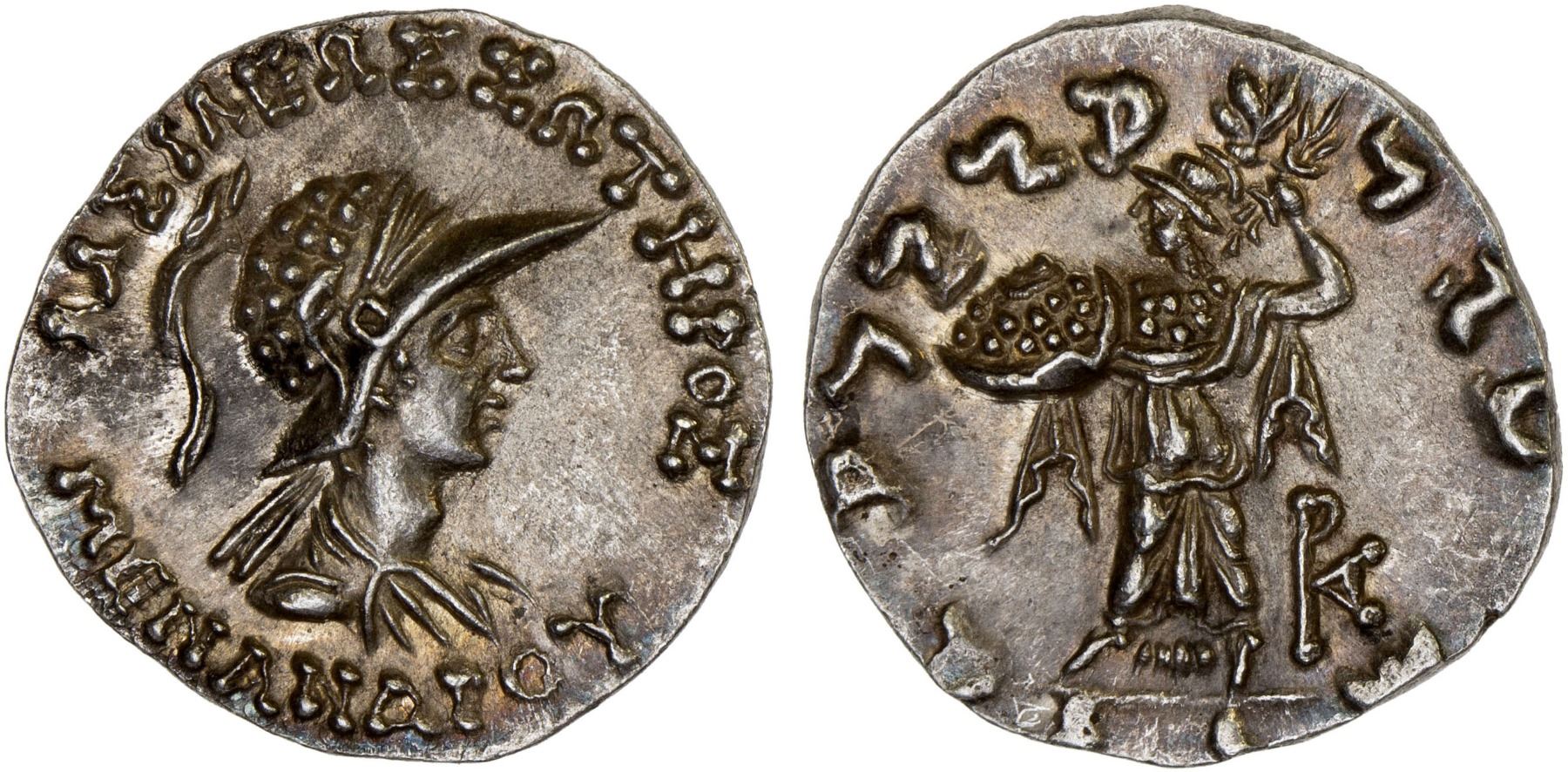 BACTRIA: Menander I Soter, ca. 155-130 BC, AR drachm (2.45g), Bop-16E, helmeted and draped bust right // Athena standing left, brandishing shield with aegis and thunderbolt, monogram to right, bold strike, choice AU.