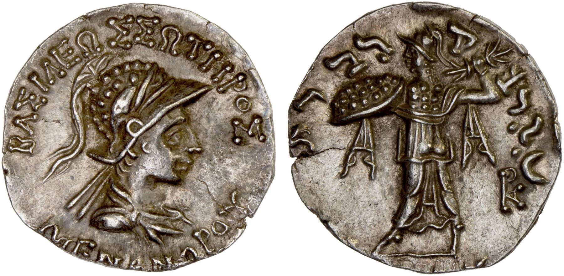 BACTRIA: Menander I Soter, ca. 155-130 BC, AR drachm (2.49g), Bop-16E, helmeted and draped bust right // Athena standing left, brandishing shield with aegis and thunderbolt, monogram to right, bold strike, XF-AU.