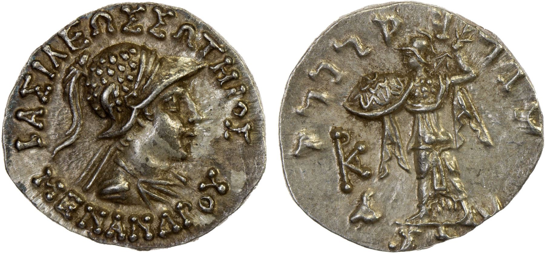 BACTRIA: Menander, ca. 155-130 BC, AR drachm (2.48g), Bop-16E, helmeted and draped bust right // Athena standing left, brandishing shield with aegis and thunderbolt, monogram to left, bold strike, choice XF.