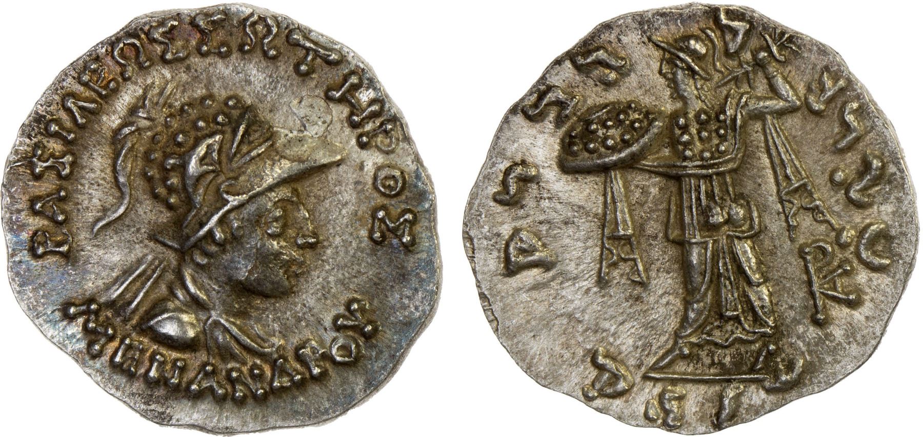 BACTRIA: Menander, ca. 155-130 BC, AR drachm (2.49g), Bop-16E, helmeted and draped bust right // Athena standing left, brandishing shield with aegis and thunderbolt, monogram to right, traces of original luster, AU.