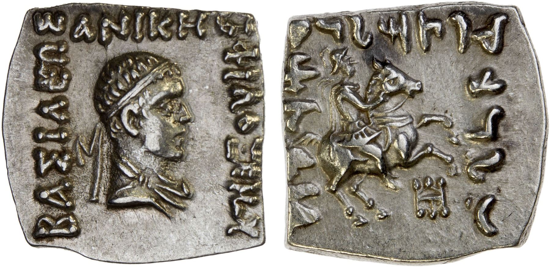 BACTRIA: Philoxenos, c. 110-80 BC, AR square drachm (2.43g), Bop-4E, diademed bust right // helmeted rider on horseback, rearing right, lovely XF.