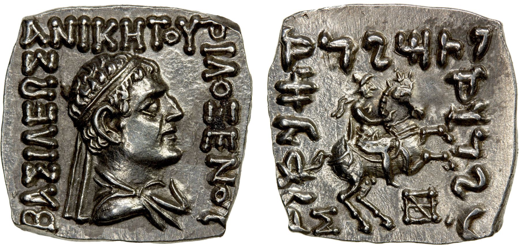 BACTRIA: Philoxenos, ca. 100-95 BC, AR square drachm (2.42g), Bop-4G, diademed and draped bust of king // helmeted and armored king on horseback, charging to right; wonderful bold strike, choice EF.