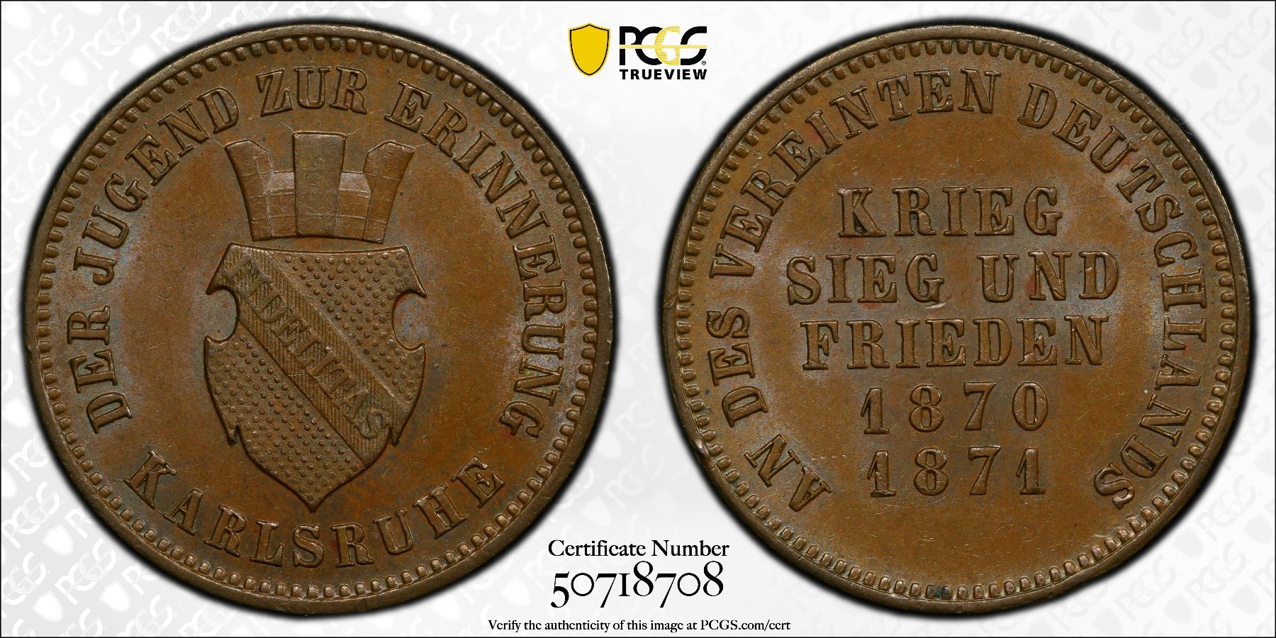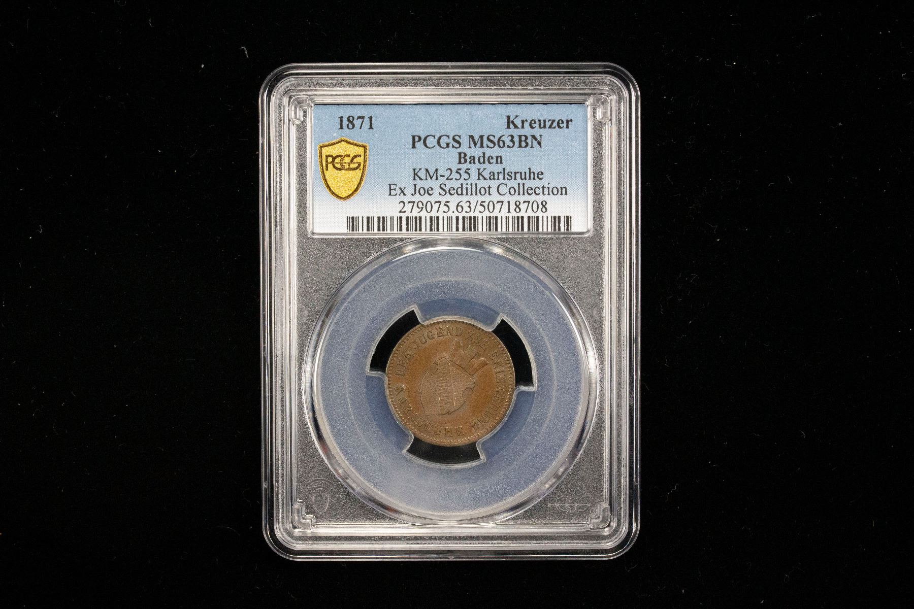 BADEN: Friedrich I, 1856-1907, AE kreuzer, 1871, KM-255, the city of Karlsruhe commemorating the victory over France, a lovely lustrous chocolate brown mint state example! PCGS graded MS63 BN, ex Joe Sedillot Collection. In 1871, when Baden joined the German Empire, it began phasing out the Kreuzer as part of a national shift to the Mark and Pfennig. This marked the end of Baden’s local currency system and the beginning of a unified imperial monetary standard.