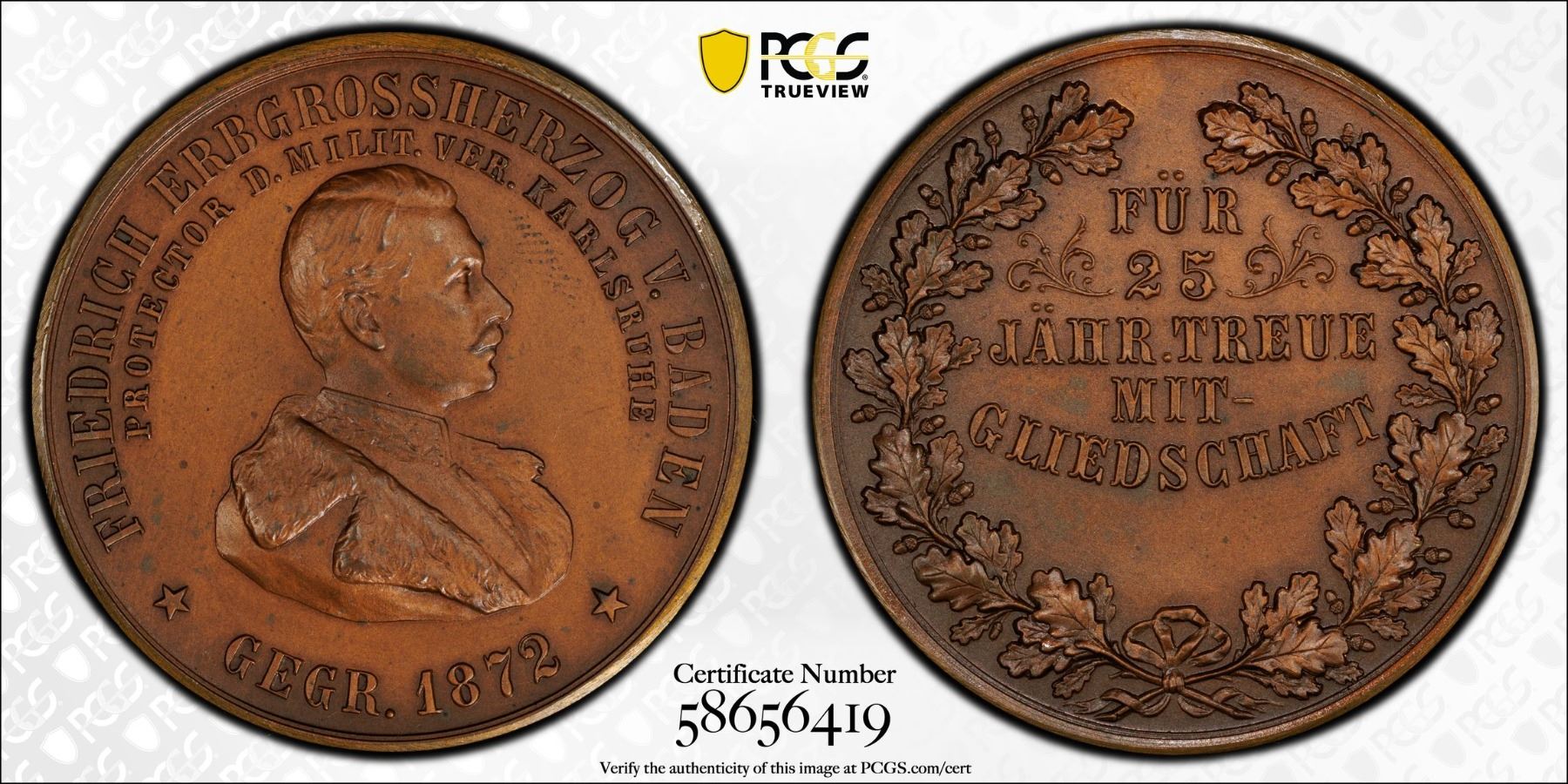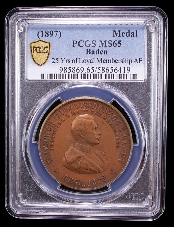 BADEN: Friedrich I, 1856-1907, AE medal (18.53g), ND (1897), 36mm bronze medal by Rudolph Mayer For 25 Years of Loyal Membership; FRIEDRICH ERBGROSSHERZOG V BADEN / PROTECTOR D. MILIT. VER. KARLSRUHE around portrait right, GEGR 1872 below // FÜR / 25 / JAHRE TREUE / MIT- / GLIEDSCHAFT, a superb mint state example! PCGS graded MS65. Medal created by Rudolph Mayer (1846-1916), a renowned medalist from Pforzheim, Germany, known for his work with the minting establishment of B.H. Mayer.