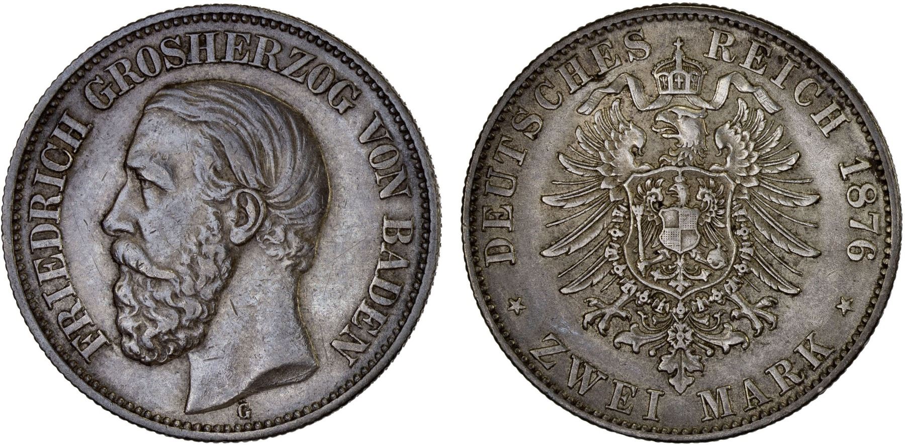 BADEN: Friedrich I, 1858-1907, AR 2 mark, 1876-G, KM-265, lightly cleaned, but has retoned nicely, VF-XF, ex Almer H. Orr III Collection.