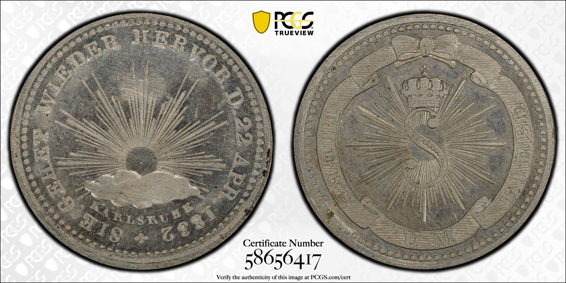 BADEN: Leopold I, 1830-1852, 1 gedenkkreuzer, 1832, KM-XM1a var, trail strike in white metal, commemorating the Recovery of Grand Duchess Sophie after the Birth of Prince Karl, a wonderful mint state example! PCGS graded MS64.