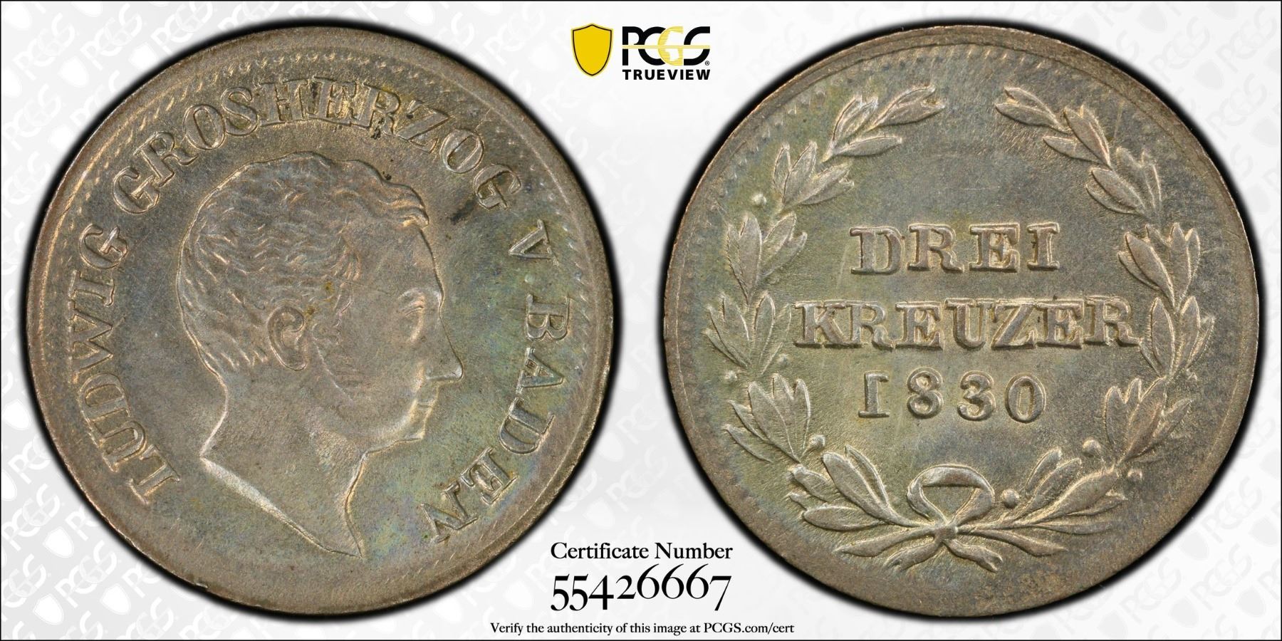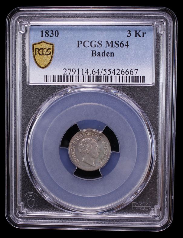 BADEN: Ludwig I, 1818-1830, AR 3 kreuzer, 1830, PCGS MS64