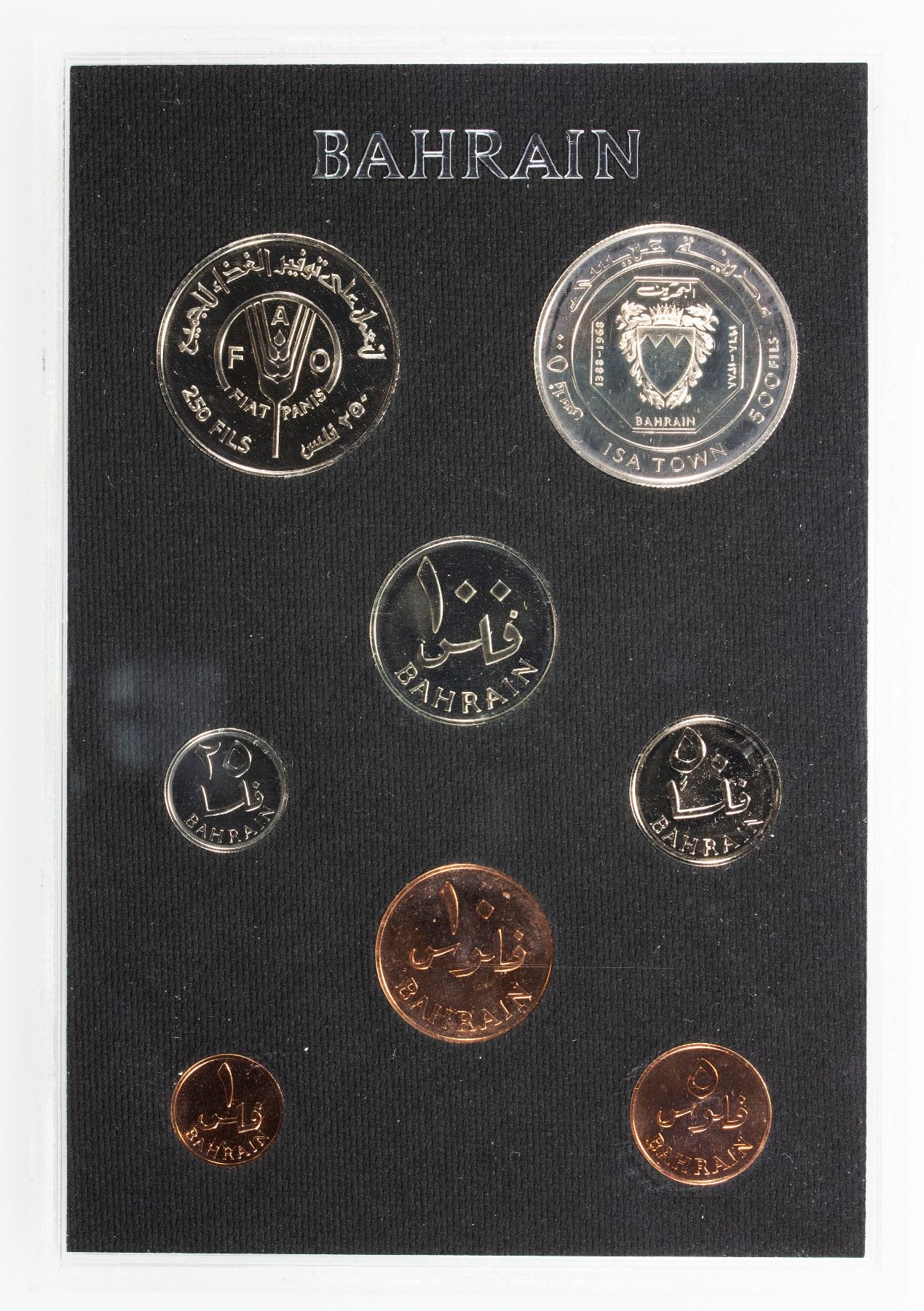 BAHRAIN: Isa bin Salman, 1961-1999, 8-coin proof set, KM-PS2, includes 500 fils 1968/AH1388 Opening of Isa Town, 250 fils 1969AH1389 FAO issue, 100, 50, 25, 10, 5 fils 1965/AH1380, 1fils 1966/AH1386, all in original British Royal Mint case of issue, set of 8 coins.